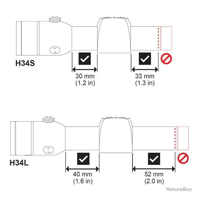 Le choix entre la version longue ou courte du point rouge va se faire en fonction du montage qui sera fait sur votre carabine (voir figure 4). Les colliers ne doivent pas Ă©craser la lentille cotĂ© prise de vue. Cela peut dĂ©tĂ©riorer l’Ă©tanchĂ©itĂ© et/ou la lentille du point rouge.