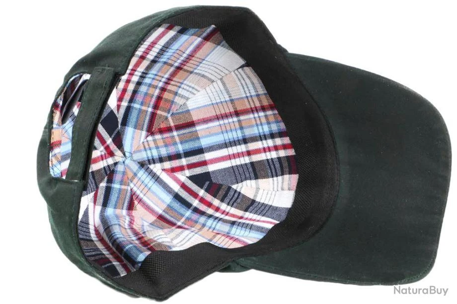 Choisir une casquette wax vert kaki en toile de coton huilé FinistÚre marque Création Française, Casquette chasse et peche look outdoor classe de forme baseball, taille ajustable, confection française avec des tissus européens, casquette imperméable doublure tissu écossais qualité chapeliÚre.