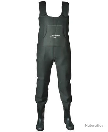 Pantalon néoprène 4 mm souple et confortable, bottes PVC. Renfort aux genoux, poche ventrale à fermeture velcro, bretelle néoprène réglables. Semelles crantées ergonomiques.